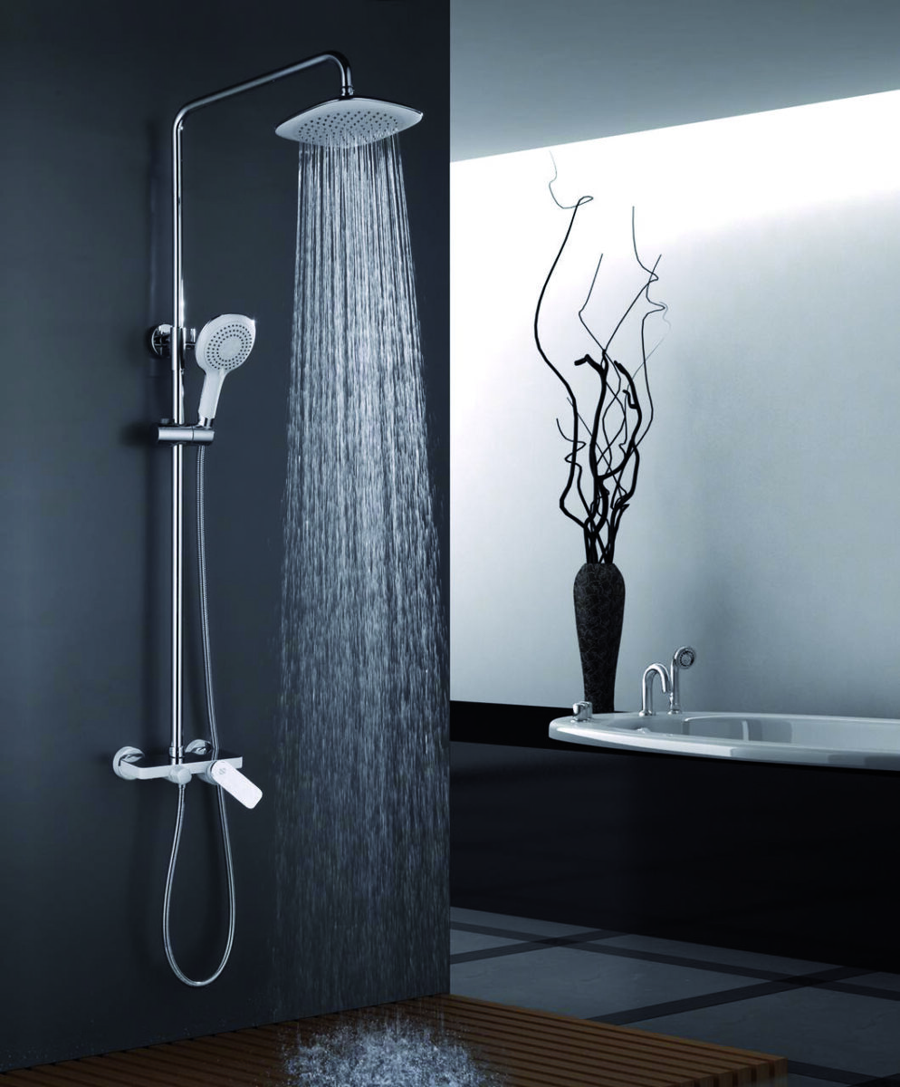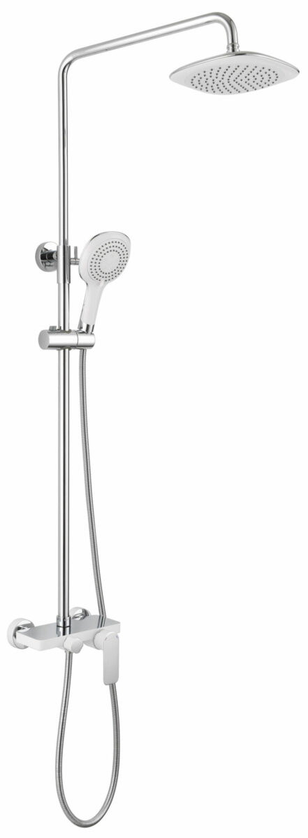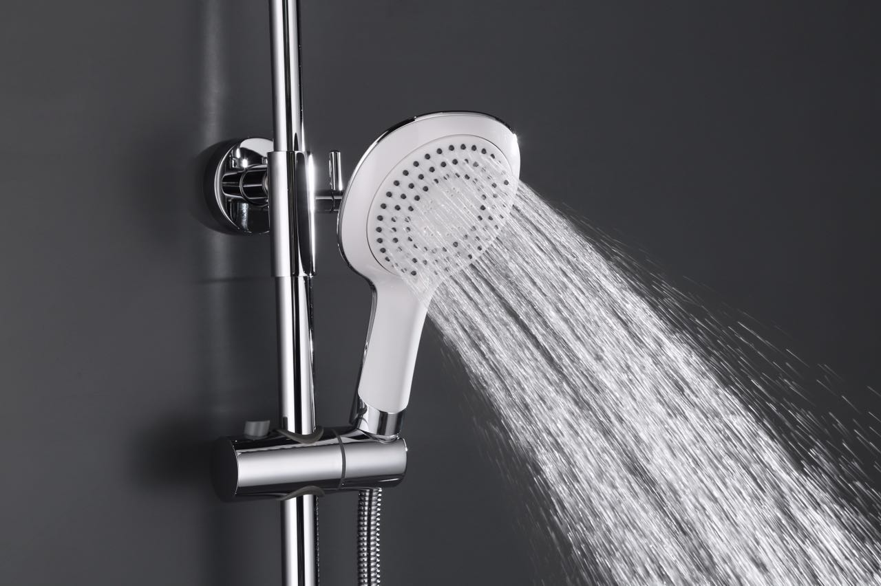 Barre télescopique en inox 90/133cm – Douchette 3 positions – Cartouche céramique 35 mm – Support régulable en hauteur – Tête de douche bi-couleur anticalcaire – Flexible double sertissage extensible