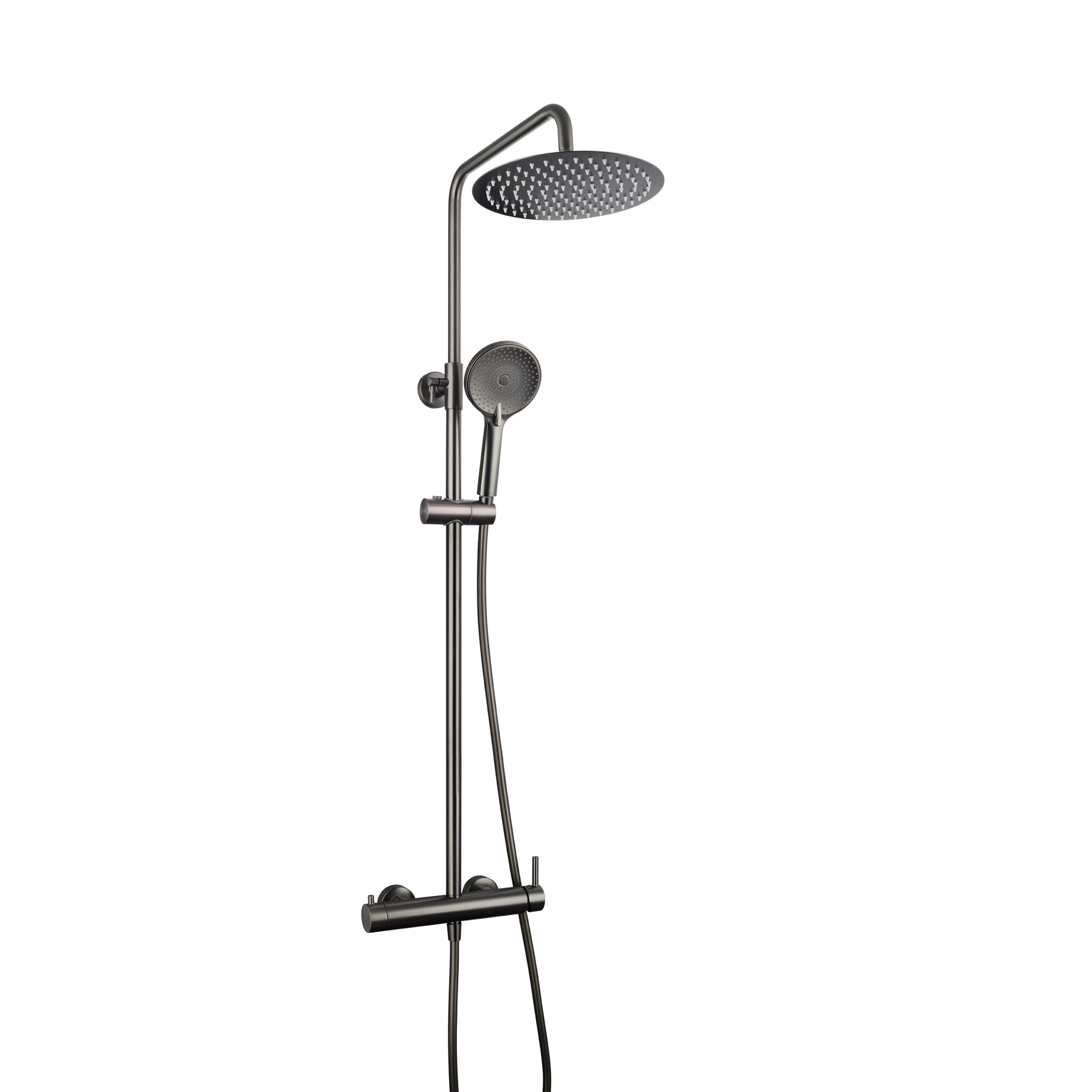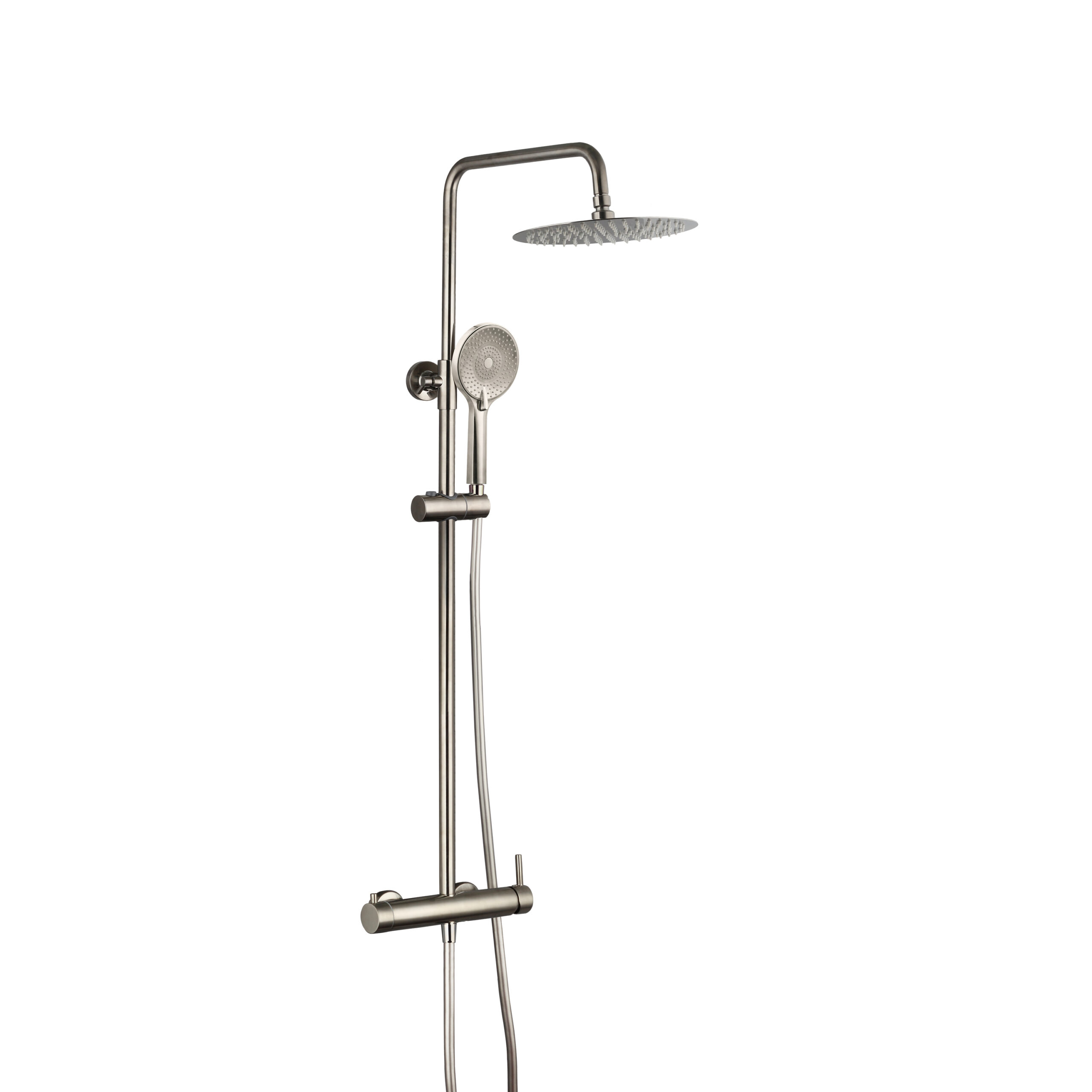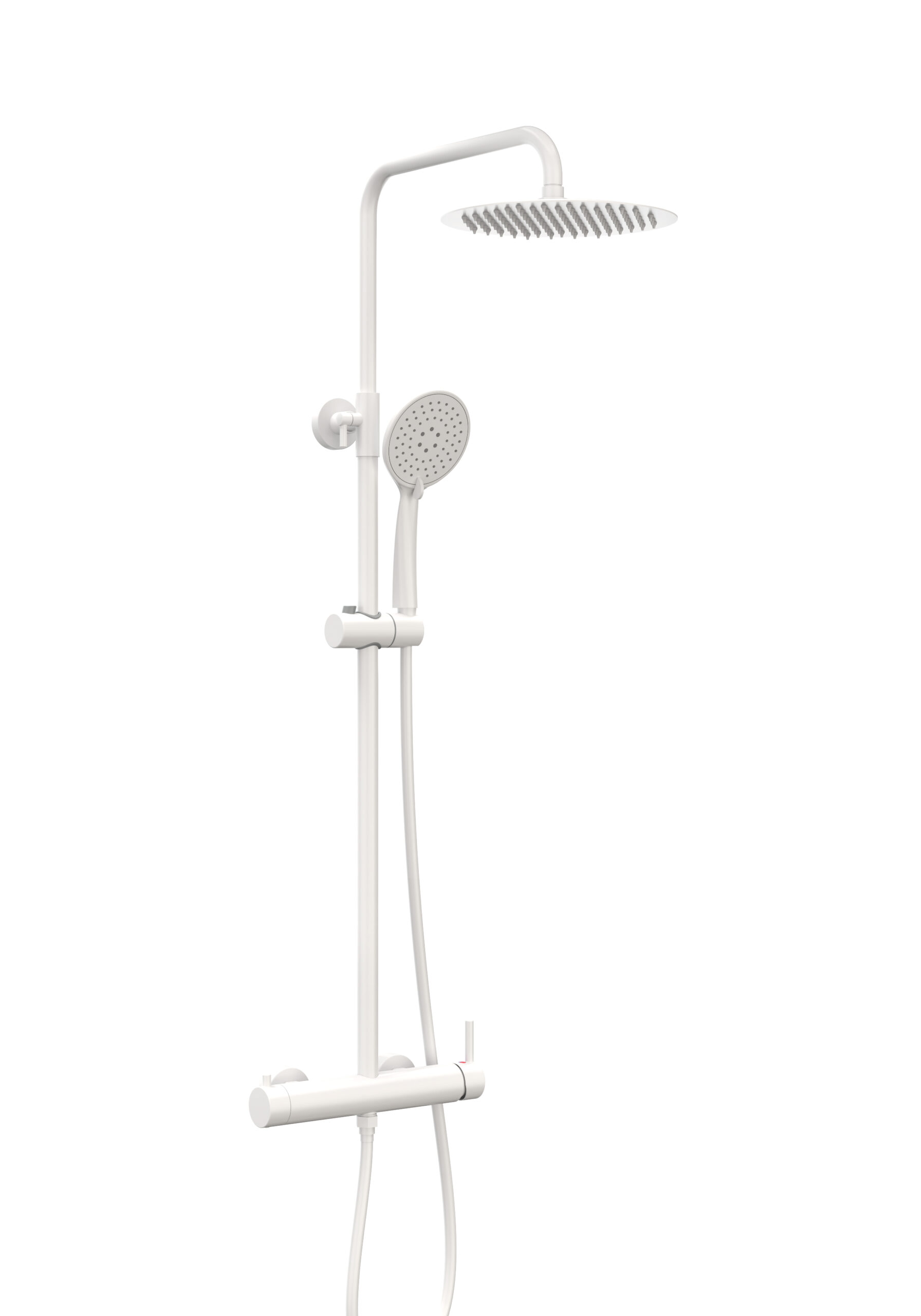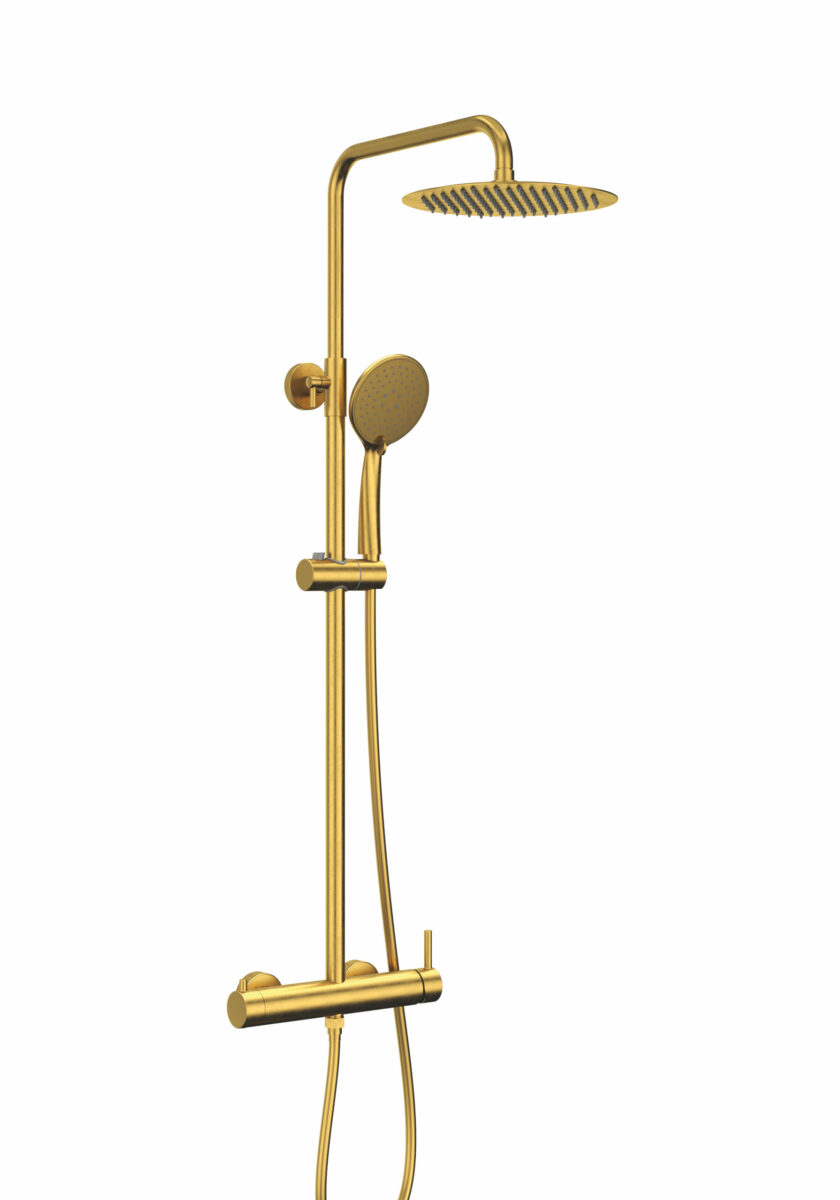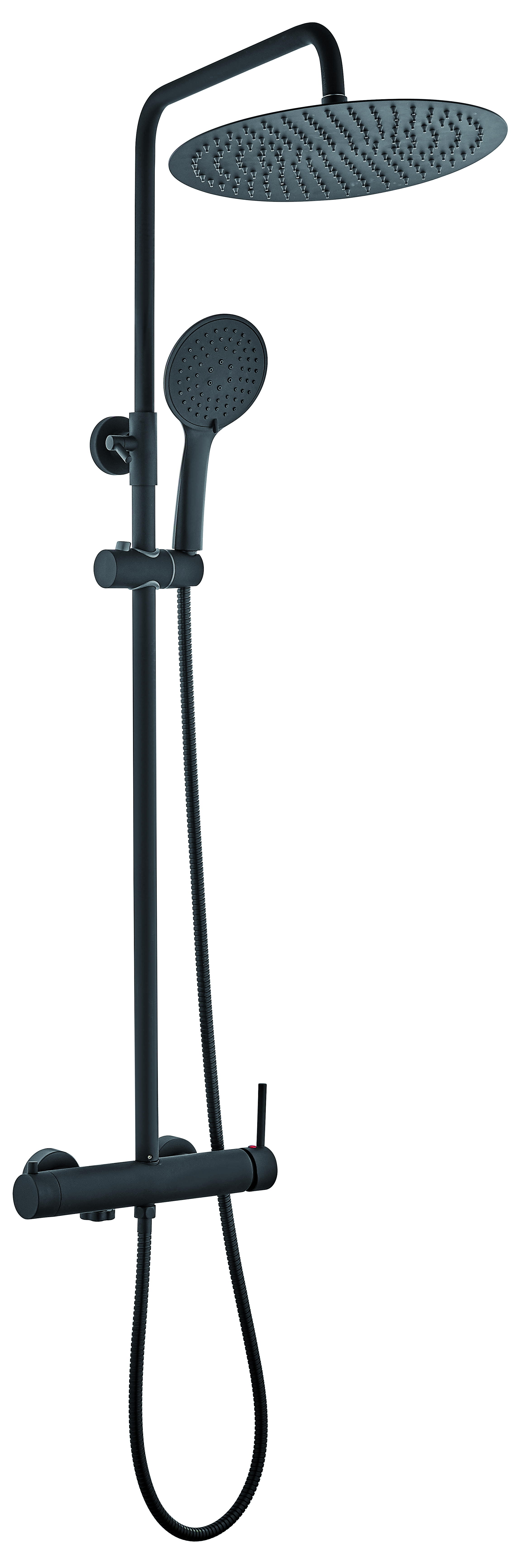 Barre télescopique en inox 90/140cm – Douchette 3 positions – Cartouche céramique 35 mm « cold-start » – Support régulable en hauteur – Tête de douche extraplat en Inox 250 mm anticalcaire – Inverseur intégré au corps de la robinetterie – Clapet anti-retour – Comprend l’option de lim. de débit écolog. 8L/min