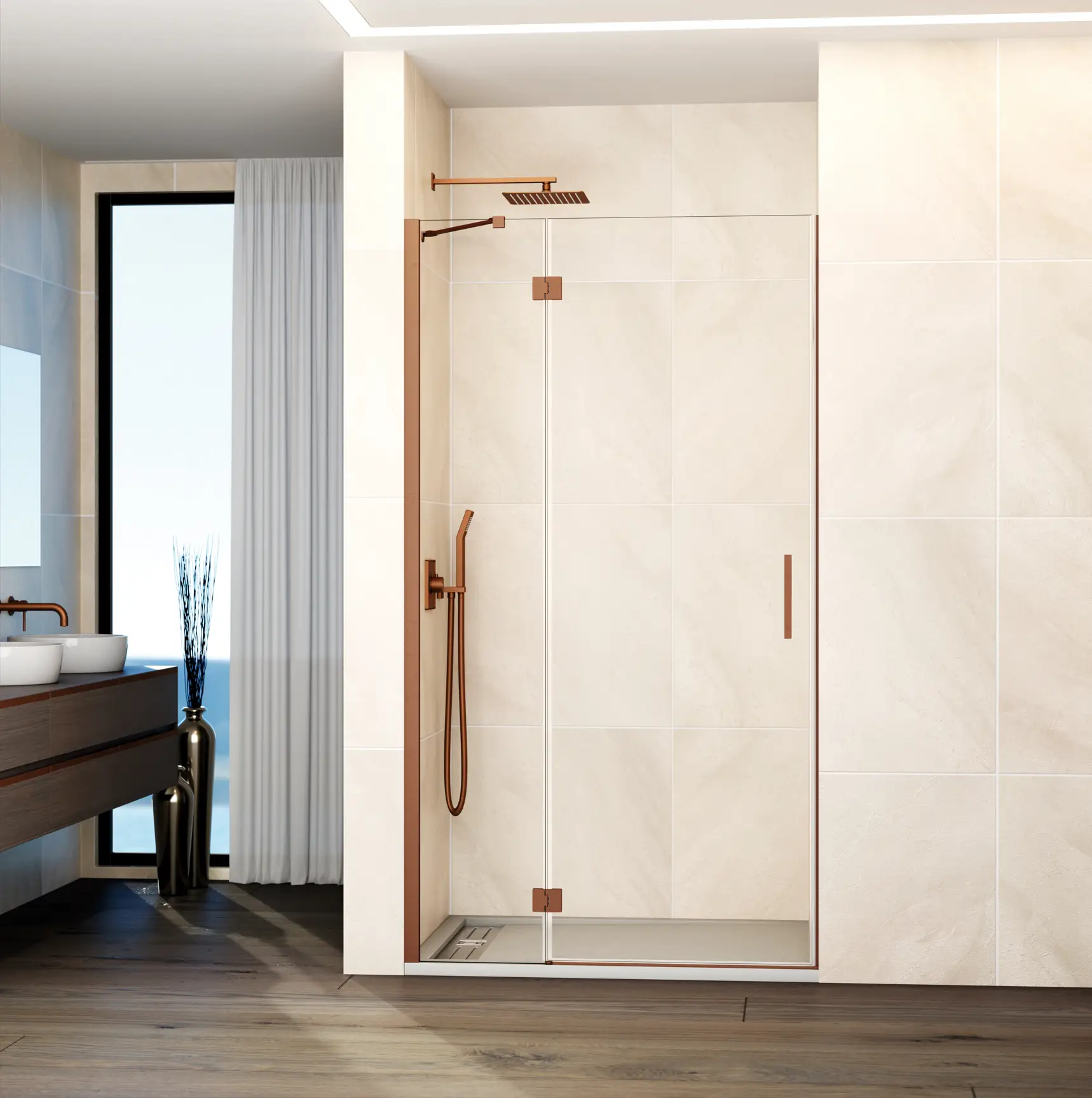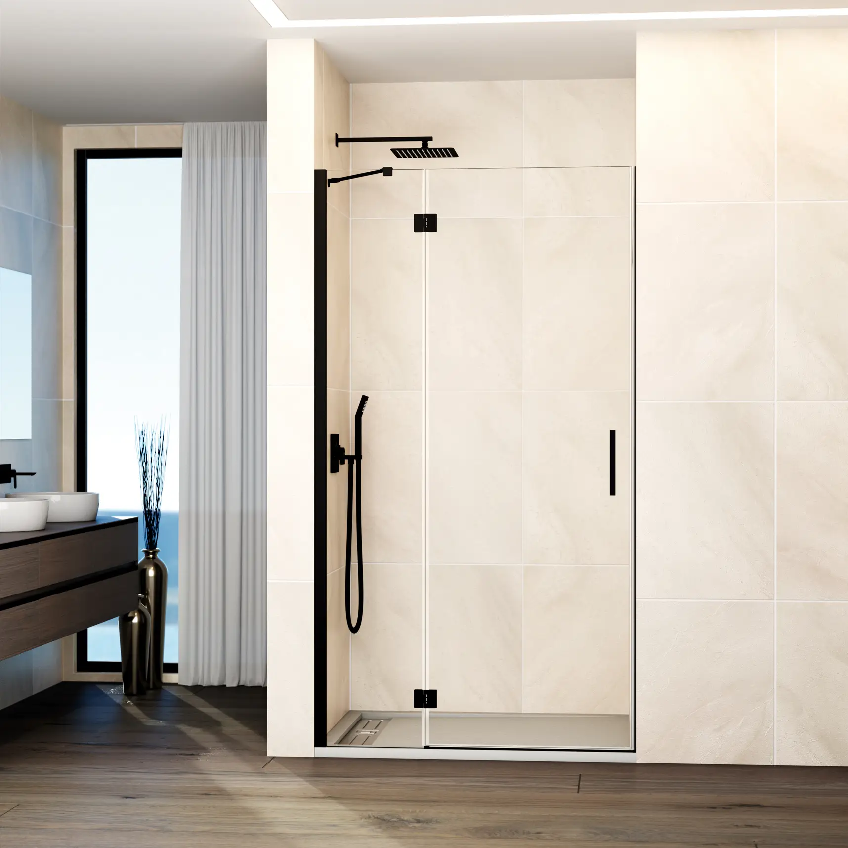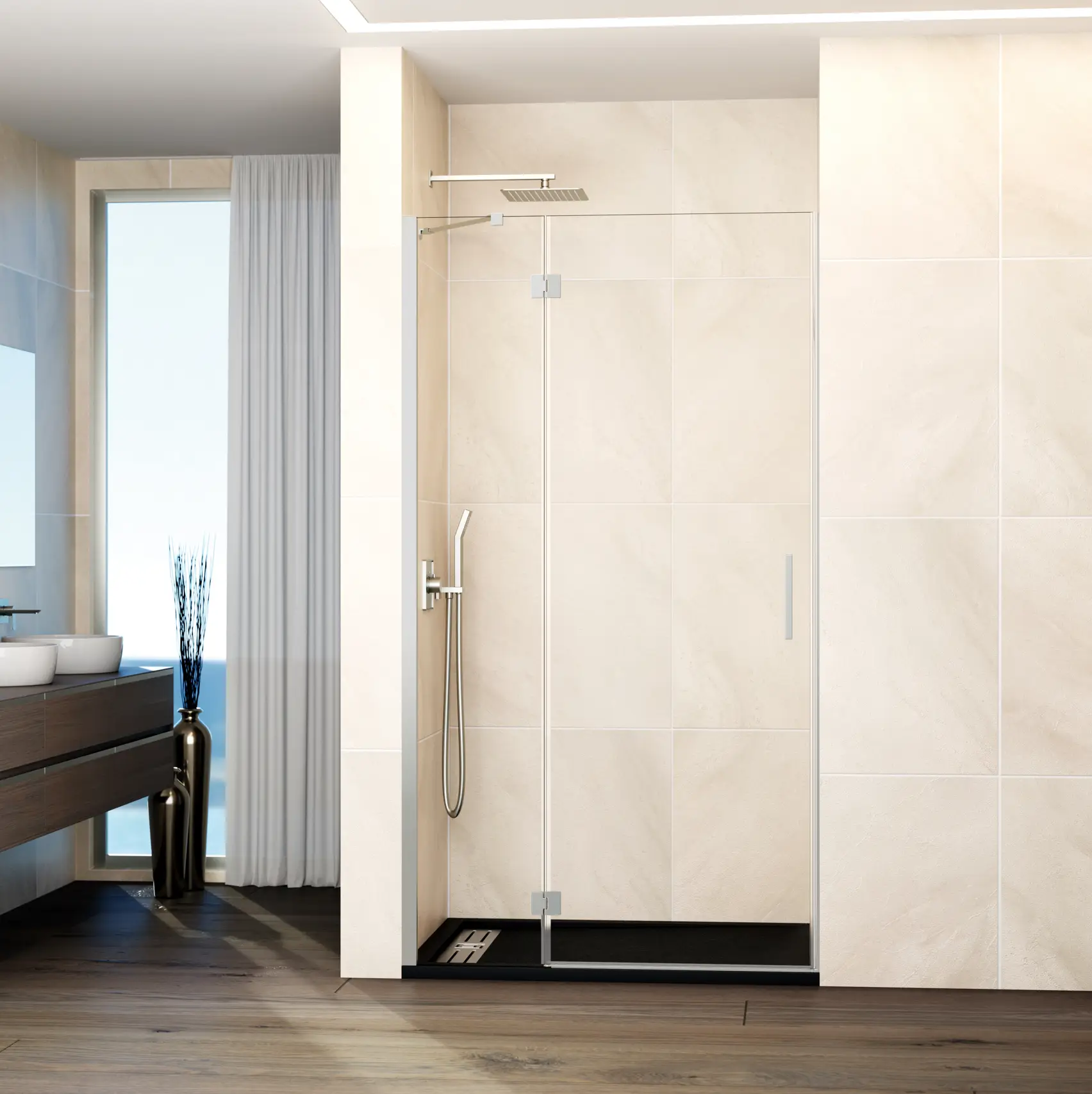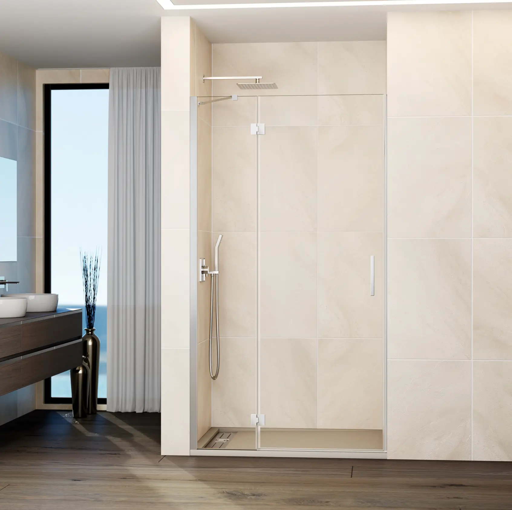 Panneau fixe + porte pivotante pour installation en niche.
