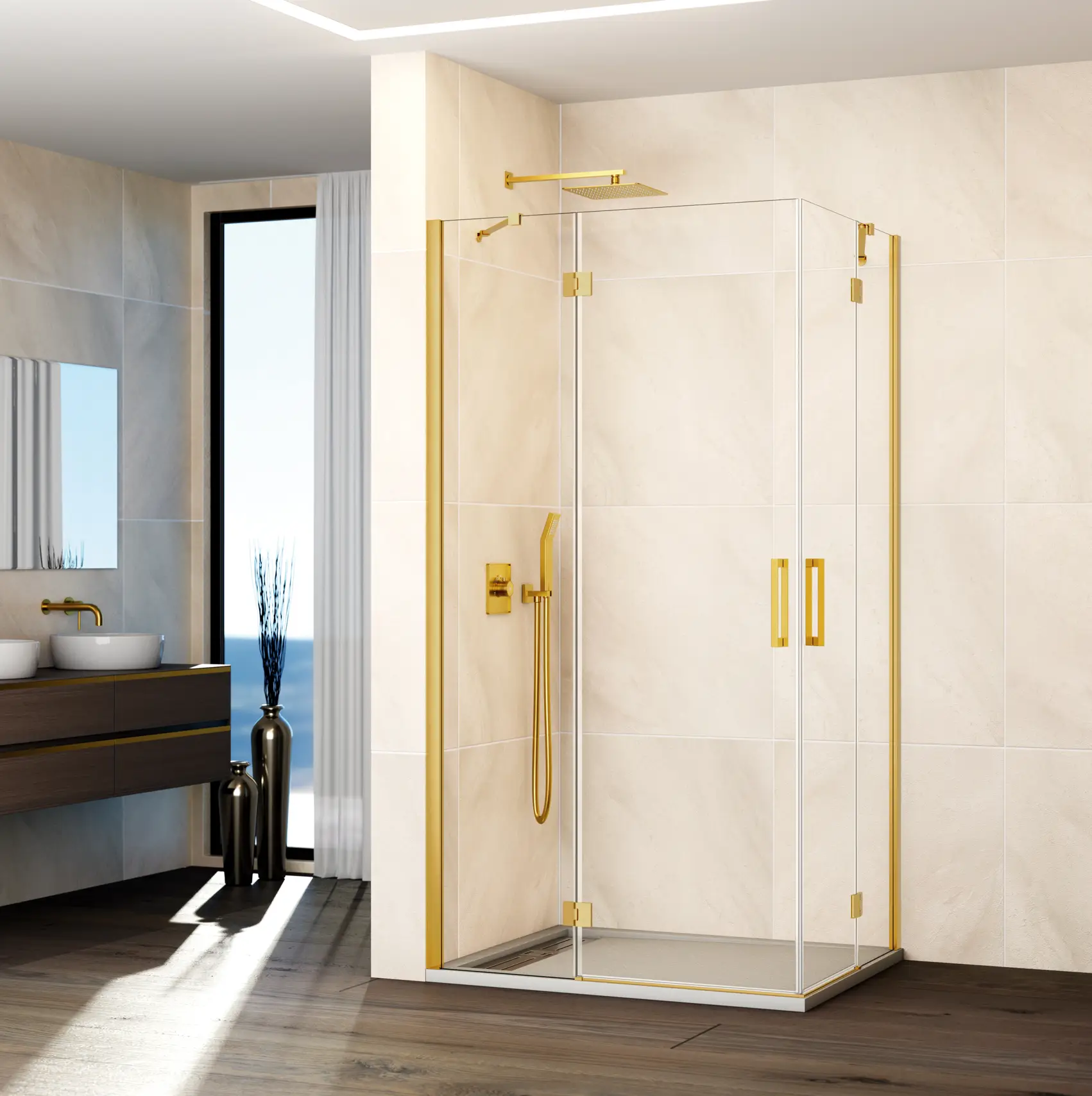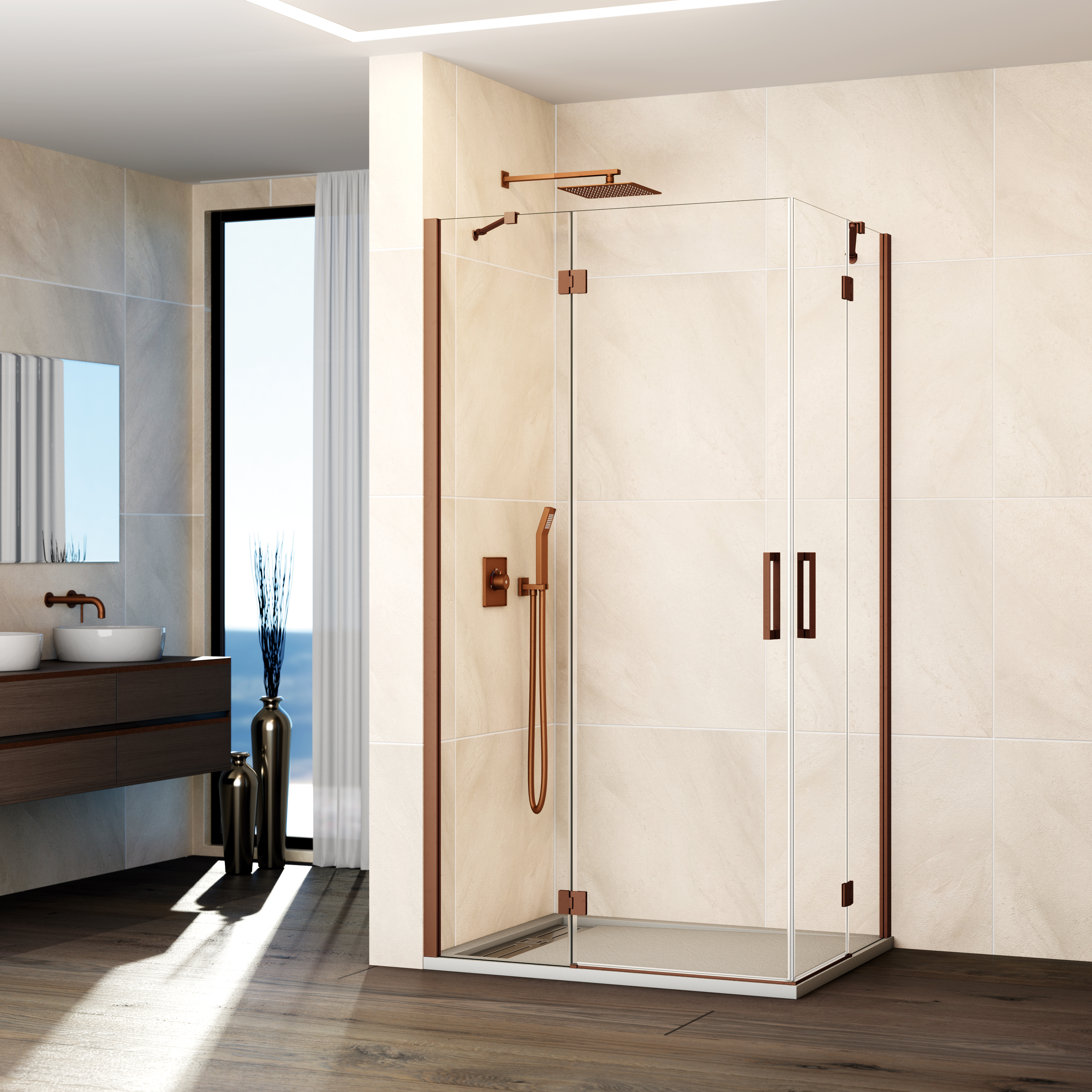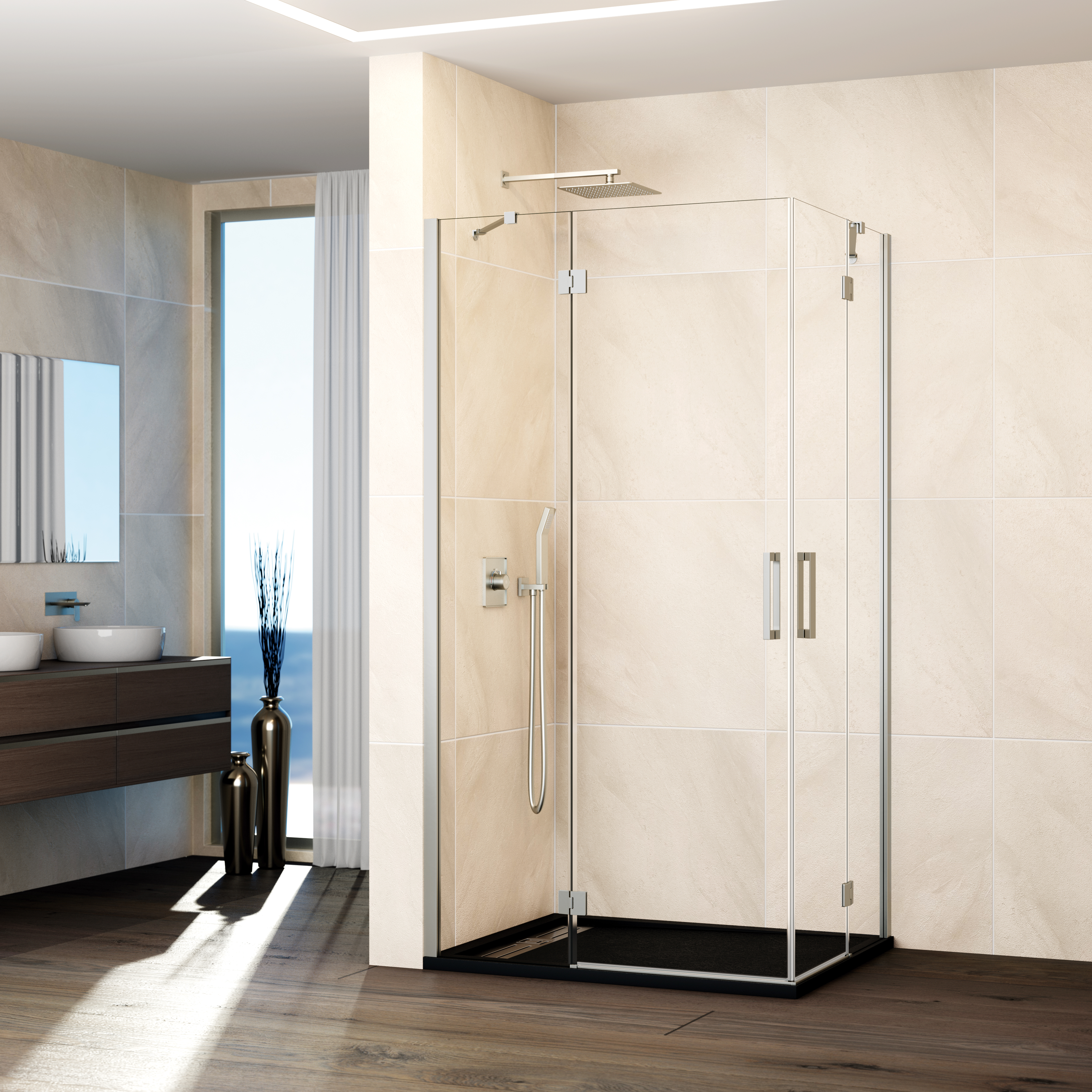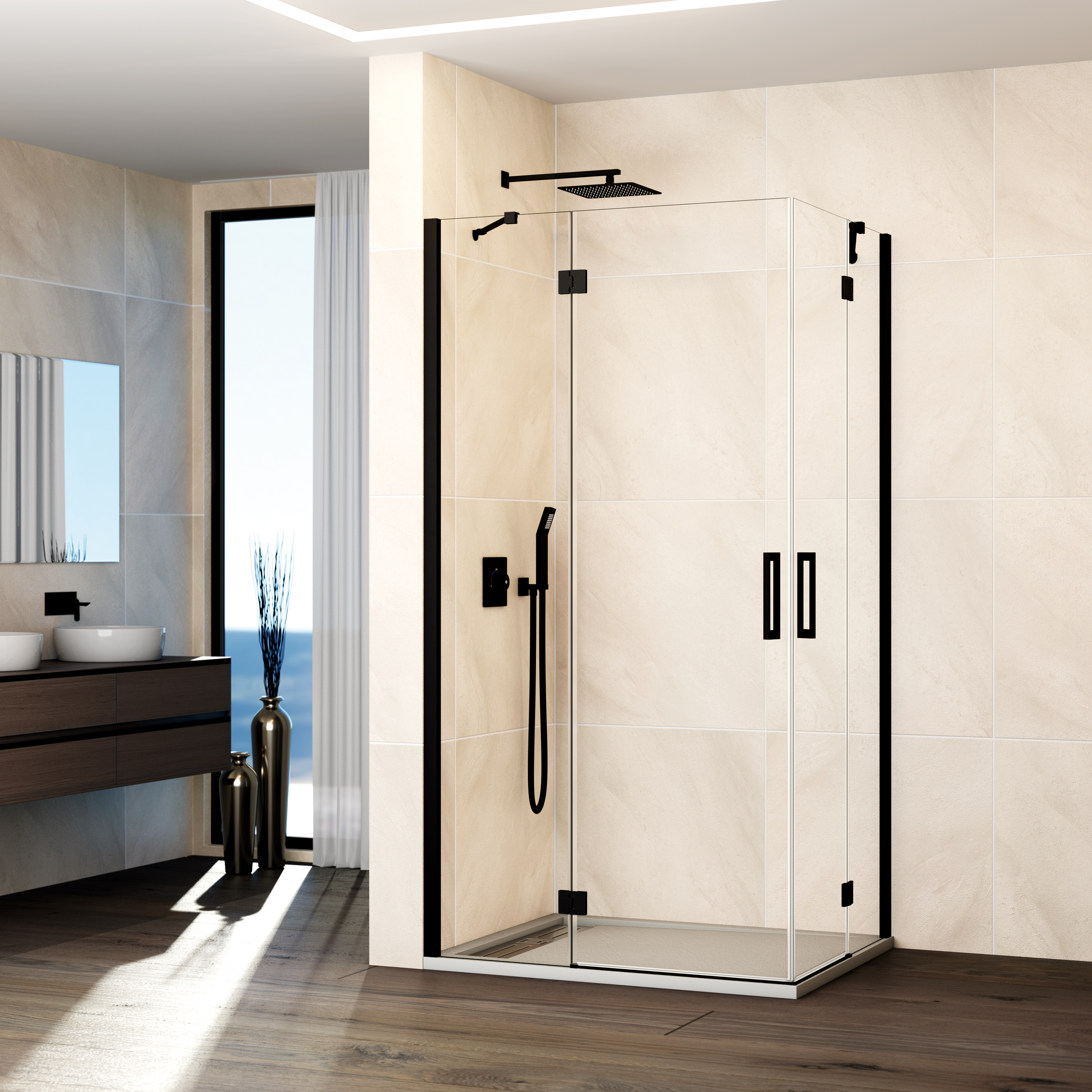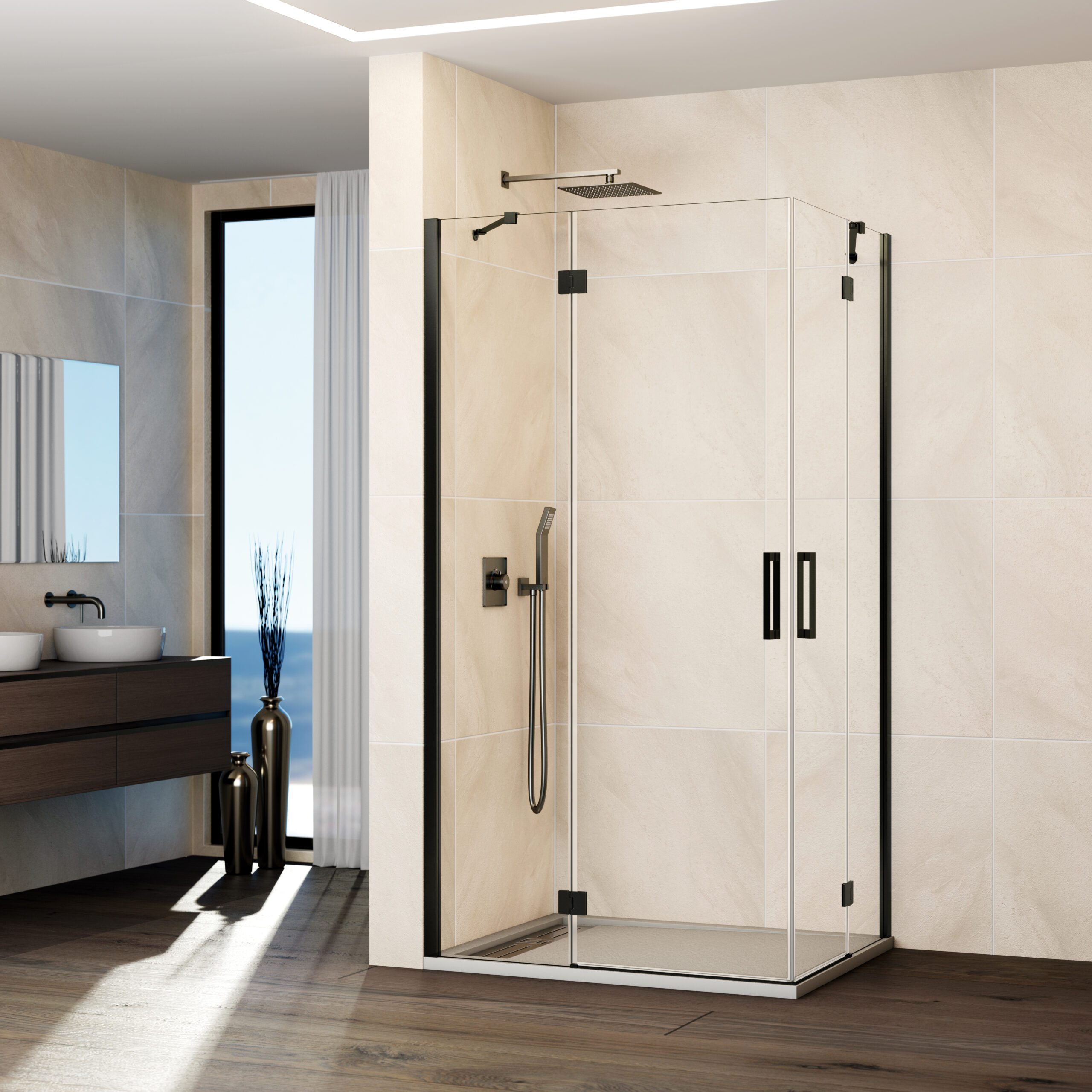 Panneau fixe et porte pivotante pour une installation en angle, optimisant l’espace disponible.