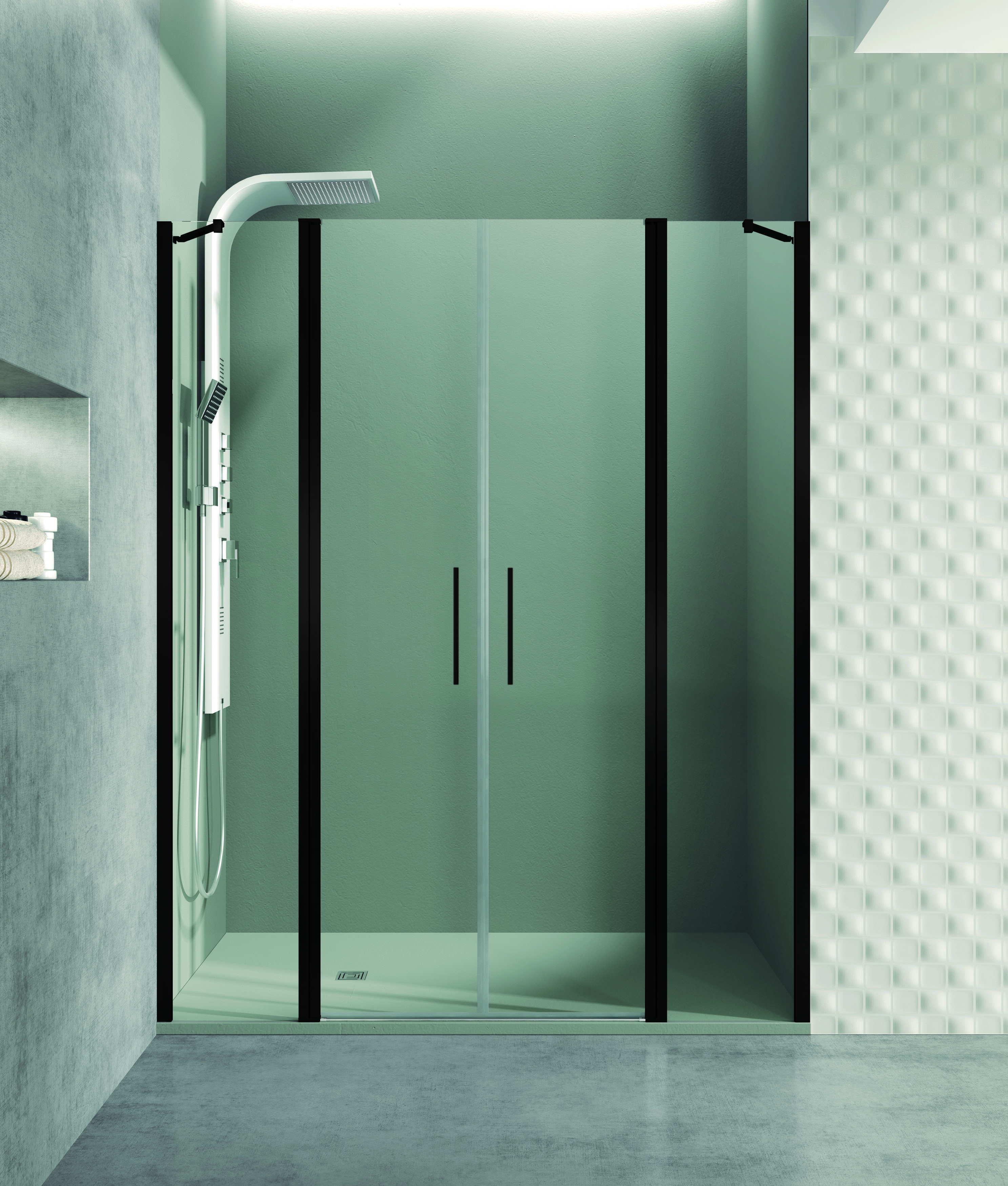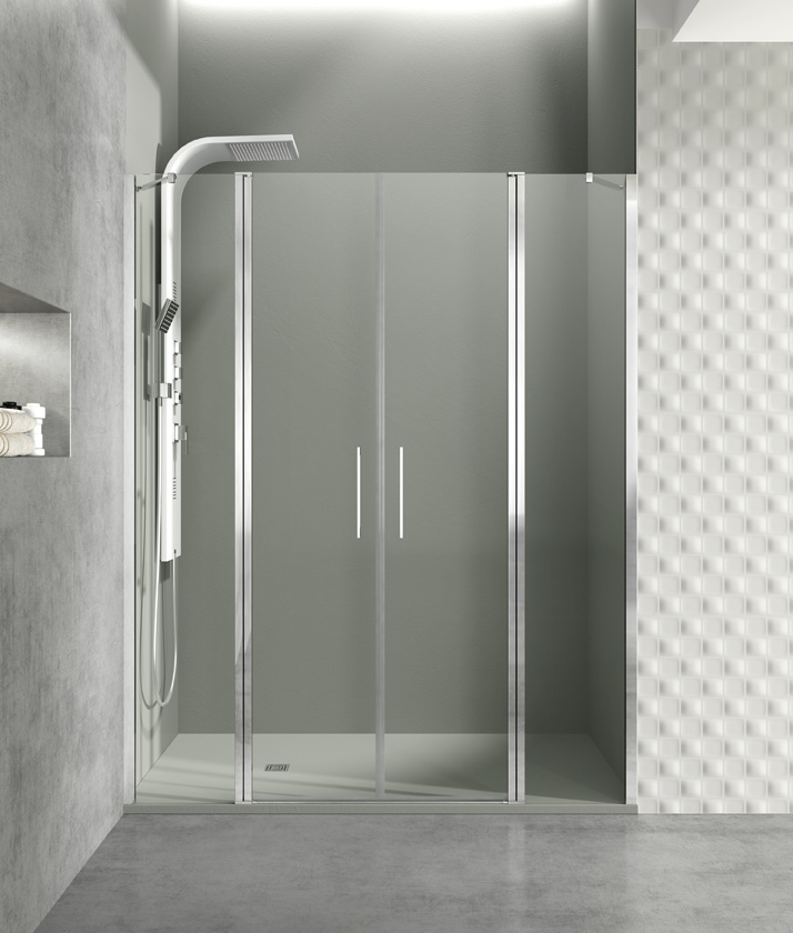 Deux portes battantes avec fermeture sur le panneau fixe pour une installation en niche, garantissant un accès spacieux et pratique.
