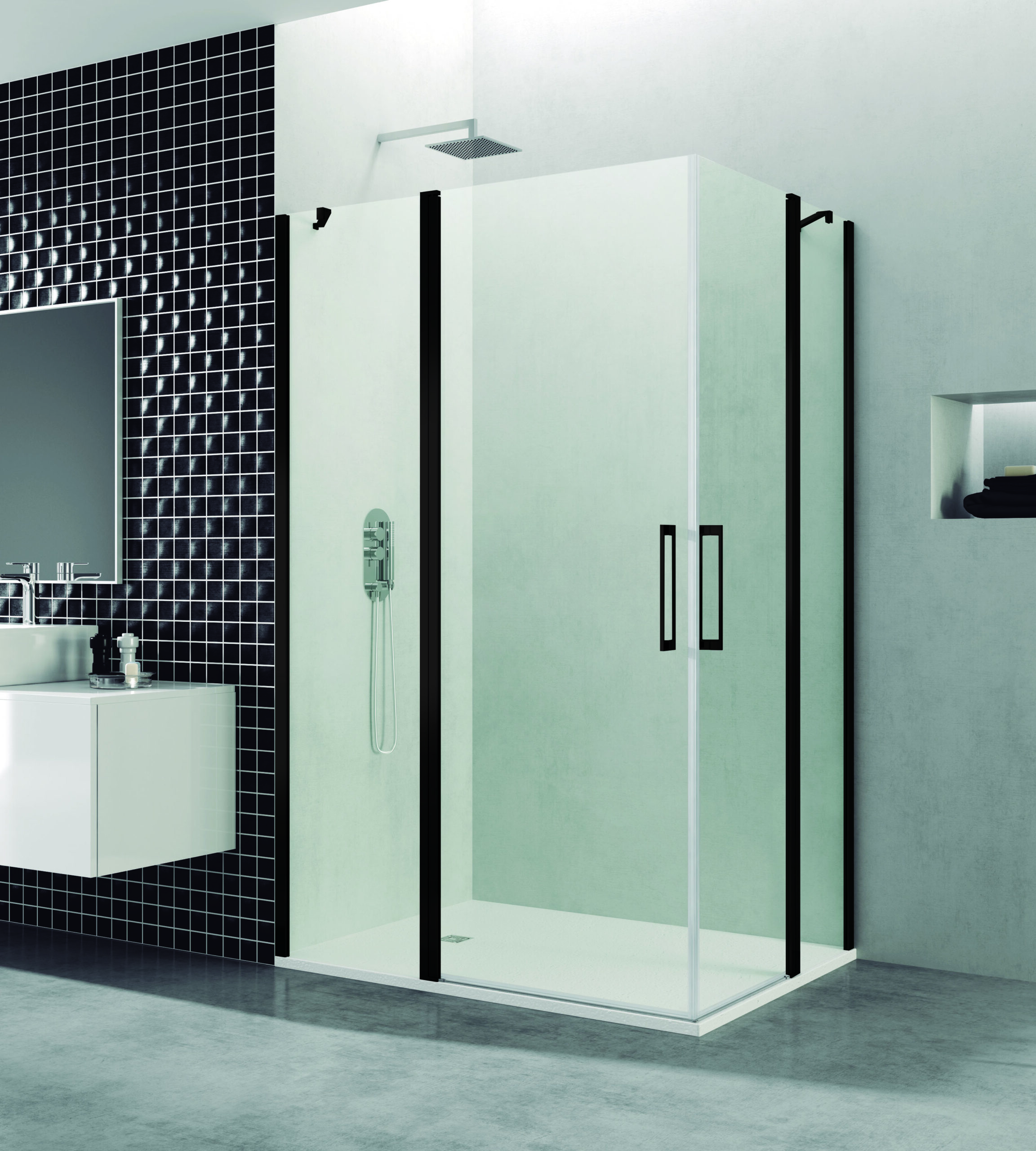 Panneau fixe et porte pivotante pour une installation en angle, optimisant l’espace disponible.